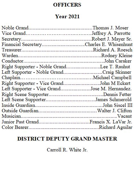 On Saturday evening, January 16, 2021 elected and appointed members of St. Louis Lodge No. 5, Independent Order of Odd Fellows were installed as lodge officers for the year 2021.